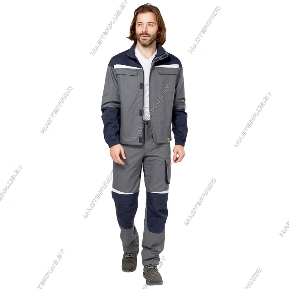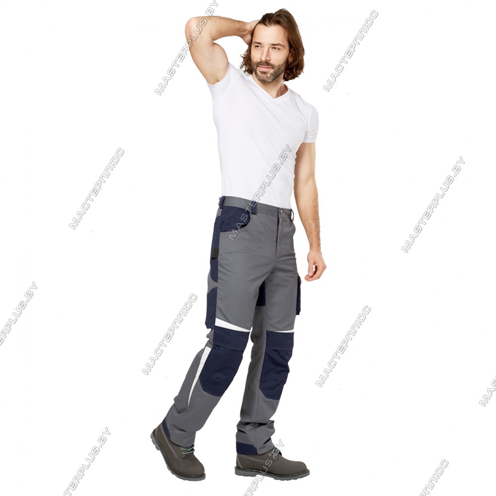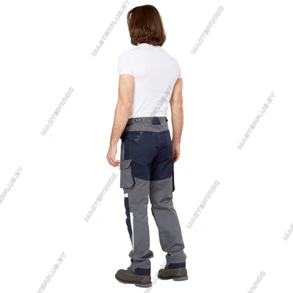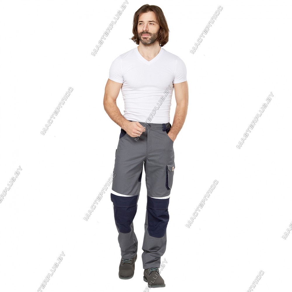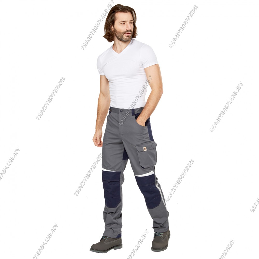 Ткань с высоким содержанием хлопка 60%, полиэфир 39%, АН (антистатичная нить) 1%. Плотность 250 г/м2, масловодоотталкивающая отделка (МВО). Цвет: серый с синей отделкой. Брюки для защиты от воздействия статистического электричества, общих производственных загрязнений и механических воздействий (Эс, З, Ми). Гульфик с застёжкой на "молнию". Усиления в области колен с отверстиями для амортизационных вкладышей. Вытачки на коленях образуют объём для комфорта при движении. Пояс со шлёвками для ремня регулируется по размеру патами на пуговицах. Два боковых и два задних кармана. В области бёдер два объёмных комбинированных кармана. Светоотражающие элементы для обозначения сигнальной видимости. Индивидуальная упаковка из спанбонда.