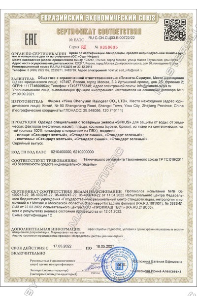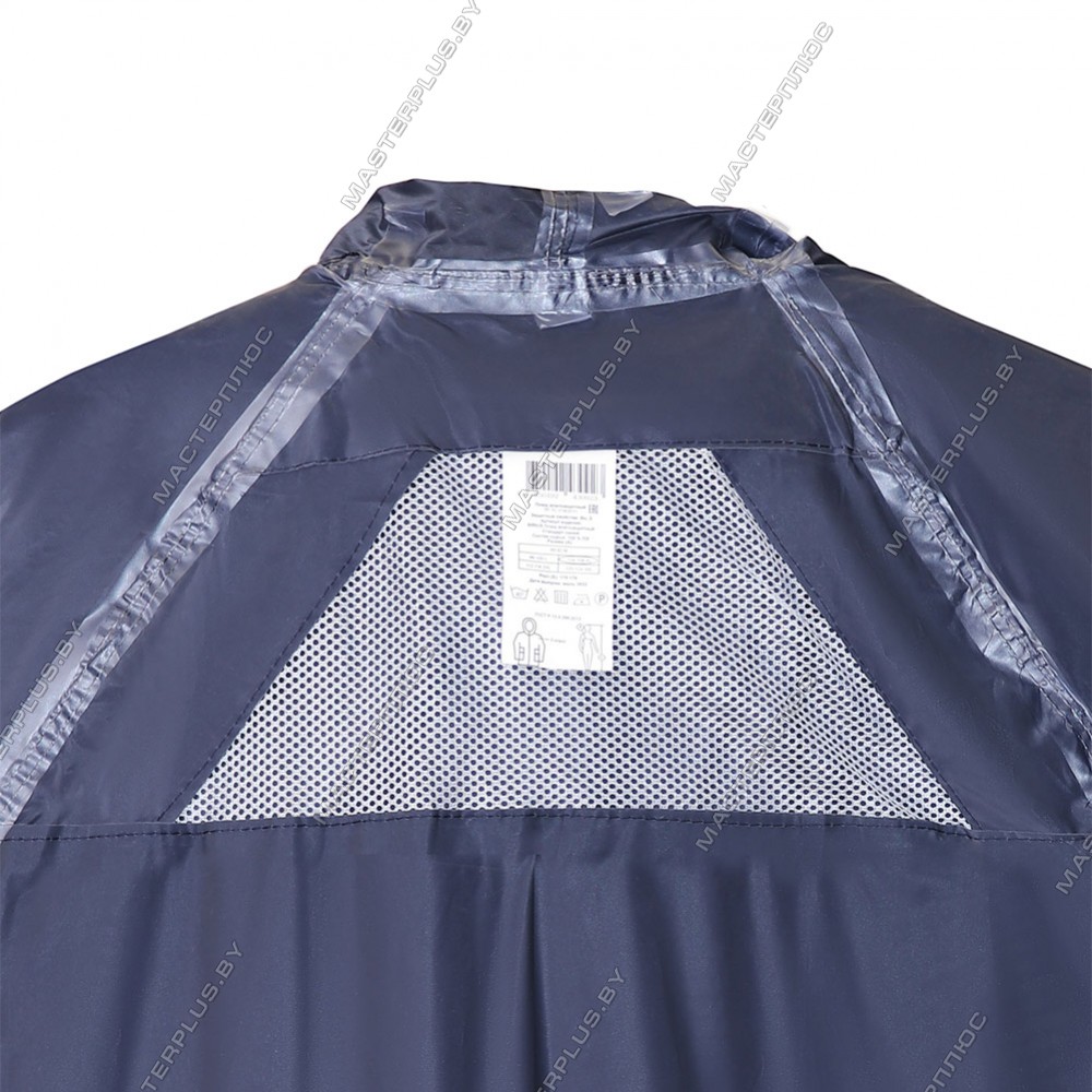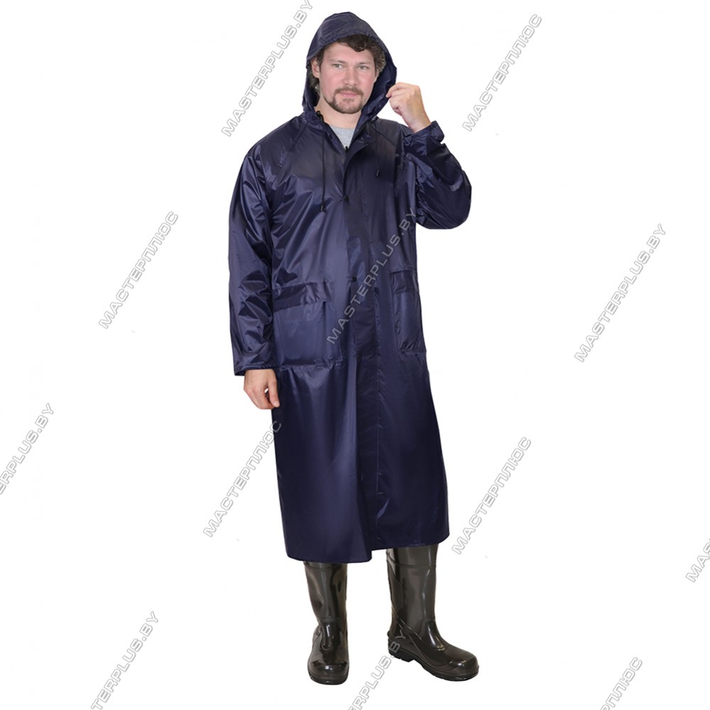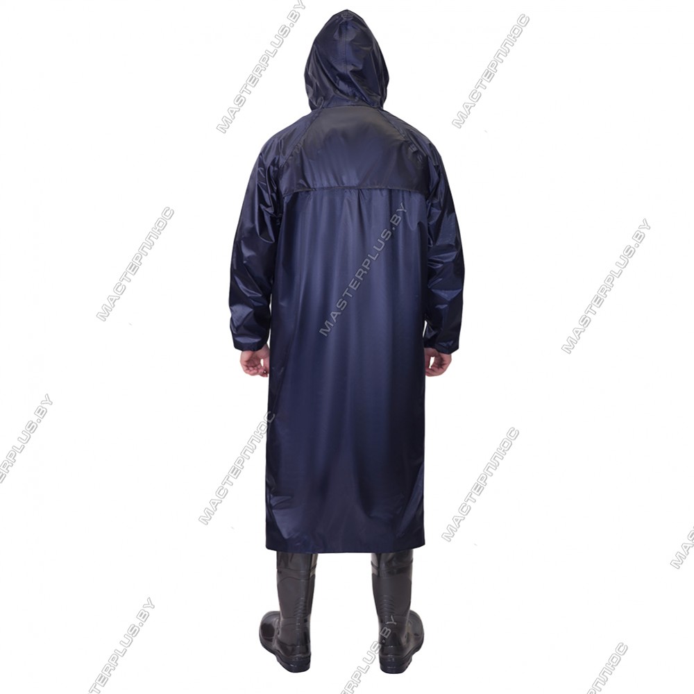 Материал: плащевая ткань (100% полиэфир с ПВХ покрытием), плотность 210 г/м2. Предназначен для защиты от воды и химических факторов (нефтяных масел). Плащ с центральной застежкой на "молнию" и ветрозащитной планкой на кнопках, с двумя накладными карманами с клапанами. Капюшон с регулировкой объёма по лицевому срезу при помощи шнура и фиксаторов. Рукава с ветро- влагозащитными манжетами на эластичной тесьме. Для дополнительной вентиляции по низу притачной кокетки на спине выполнены клапаны с сетчатым материалом. Все швы плаща проклеены изнутри специальной лентой и герметичны. Водоупорность более 5000 мм водного столба.