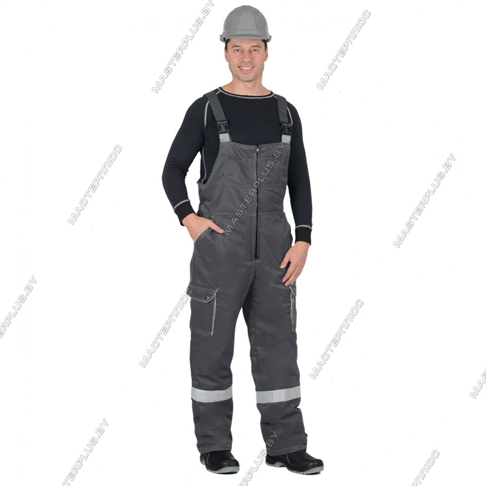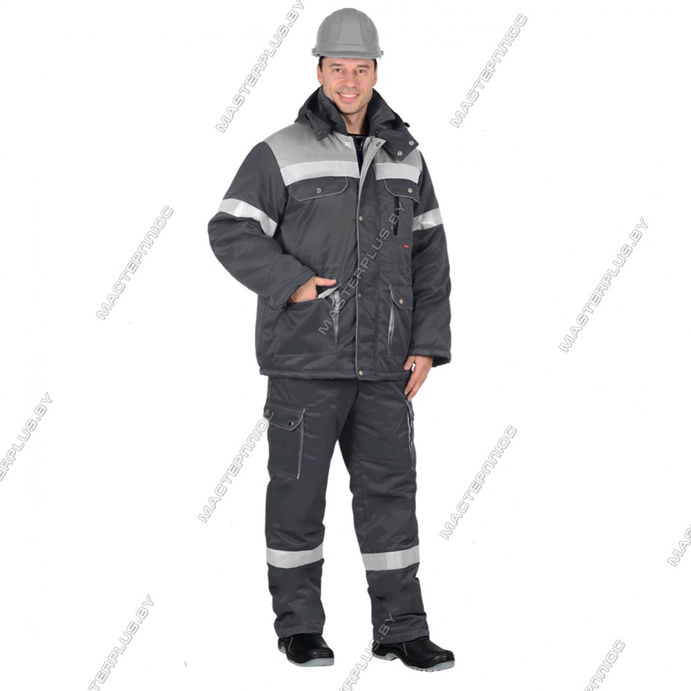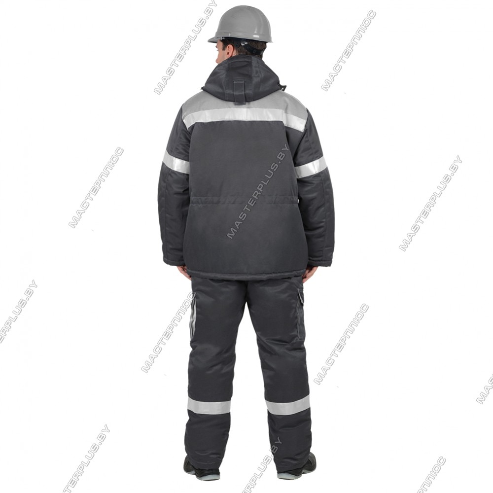 Комплектация: куртка и полукомбинезон. Цвет тёмно-серый с отделкой светло-серого цвета. Материал верха смесовая ткань (хлопок + полиэфир) плотностью 215 г/м2, с ВО пропиткой. Подкладка – ПЭ 100%. Утеплитель – синтепон (3 слоя по 150 г/м2). Куртка с застёжкой на двухзамковую "молнию" с ветрозащитной планкой на кнопках, с отложным воротником. Капюшон-стойка пристёгивается на кнопки, имеет регулировку объема и размера по лицевому срезу и в затылочной части. Ушки капюшона удобно фиксируются кнопками. Рукава с внутренними трикотажными напульсниками. Два нагрудных кармана с клапанами на кнопках. Два боковых полуобъёмных кармана с клапанами на кнопках и один внутренний карман. Объём куртки регулируется при помощи эластичного шнура с фиксаторами в области талии. Светоотражающие элементы на переде, спинке и рукавах. Полукомбинезон с эластичными бретелями на фастексах, с центральной застжкой-"молнией". Два нагрудных кармана, два боковых прорезных и дополнительные полуобъёмные карманы в области бёдер. Световозвращающие полосы 50 мм. по низу полукомбинезона для обозначения сигнальной видимости.